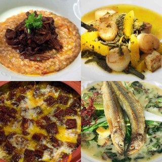 4Перед подачей нарезать рулет ломтями толщиной 2 см и обжарить на сливочном масле до хрустящей корочки. Скоблянку разогреть и разложить по тарелкам. Сверху выложить куски свиного рулета. Украсить оставшимся тимьяном.
