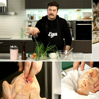 1Взять рыночную курицу среднего размера, весом чуть больше килограмма. Это должна быть курица с целостным кожным покровом. Идеально, если она будет выпотрошена через шею. Если вам досталась традиционно выпотрошенная курица, нужно плотно зашить ей нутро крепкой ниткой. Аккуратно засунуть пальцы под кожу со стороны шеи. Отделить кожу от куриной плоти. Не снимать, а именно отделить. Необязательно отделять кожу полностью, хотя бы наполовину. Кожу нельзя рвать.
