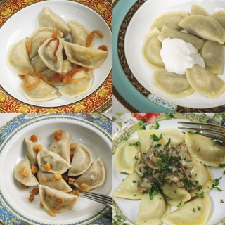 1Для теста смешать 0,5 килограмма пшеничной муки и 430 грамм картофельного крахмала, разбить в смесь 4 яйца, размять массу руками. Постепенно влить холодную воду, начав с одной столовой ложки, и добавлять по необходимости: тесто должно стать однородным. Положить ком на присыпанную мукой поверхность и хорошо его размять, тесто должно стать шелковистым и не липнуть к рукам. Накрыть пленкой, дать постоять при комнатной температуре двадцать минут. Раскатать в пласт толщиной 3 мм и вырезать кружки диаметром около 8 см.