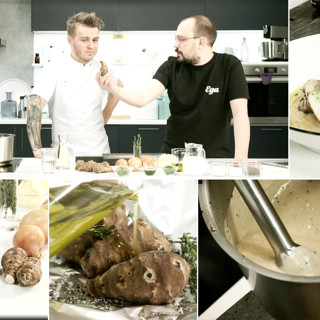 Сначала топинамбур запекают в духовке, а затем погружают в густой сливочно-луковый соус. Рецепт Владимира Чистякова — шеф-повара ресторана Buro TSUM.
