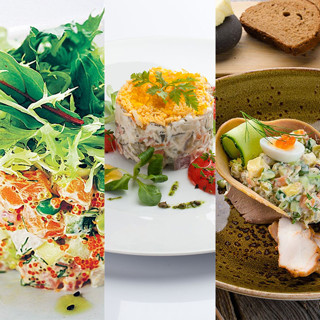 Этот оливье, рецептом которого с нами поделился бессменный шеф-повар «Кафе Пушкин» Андрей Махов, состоит из двух частей: первая — домашний оливье с куриной грудкой, а вторая — оливье,