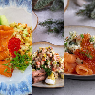 Оливье с перепелкой, раковыми шейками и красной икрой