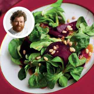 На салат набросать ломтики свеклы, посыпать сверху кедровыми орешками, залить соусом и небрежно — большими салатными ложками — всю эту компанию перемешать.