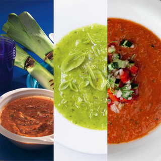 3Разлить по тарелкам томатное пюре, сверху выложить нарезанные овощи с чоризо и украсить зеленью. Сбрызнуть оливковым маслом.