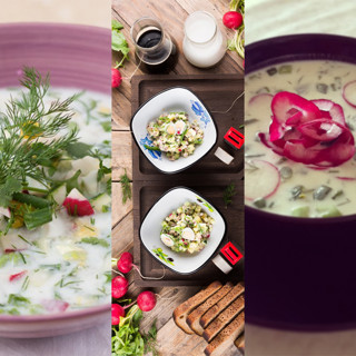4Мацони перемешать с минеральной водой. Залить в емкость с овощами и языком. Перемешать. Полученную окрошку разлить по тарелкам. Украсить вареным перепелиным яйцом, разрезанным пополам, и зеленым луком.