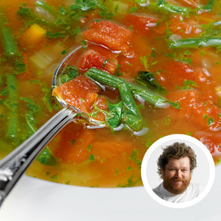 3Добавить зеленую фасоль и вермишель, через три минуты — помидоры и белую фасоль, варить еще минуту, посолить, поперчить — и вмешать пробитые в блендере сыр и базилик.