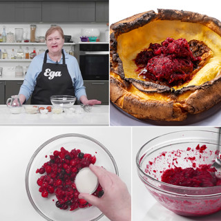 9Перемешать венчиком тесто и вылить его в центр сковороды (если сковорода меньше 24 см в диаметре, лучше разделить тесто пополам и испечь два блинчика по очереди). Поставить сковороду в печь и отпекать и выпекать при температуре 250 градусов 15 минут. Затем снизить температуру до 210 градусов и допекать еще 10 минут до золотистых бортиков.