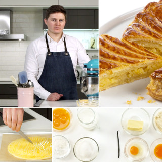 3Из слоеного теста вырезать два диска, выложить на один из них крем франжипан ровным слоем, отступая от краев теста на 1–2 см. На этом этапе можно вложить в пирог сюрприз в виде сухой фасолинки или небольшой фарфоровой фигурки. Смочить края теста водой, накрыть вторым диском слоеного теста и аккуратно прижать края, стараясь не сильно деформировать его.