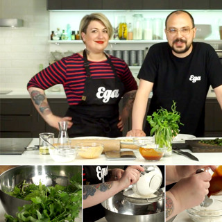 4Обжарить кутабы на сухой сковороде с обеих сторон. Смешать мацони с соусом кимчи и подать к кутабам.