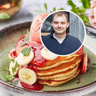 6Подавать панкейки, выложив их на тарелке стопкой. Сверху полить клубничным вареньем, рядом положить дольки банана и сверху шарик клубничного мороженого. Украсить лепестками мяты.