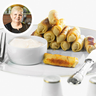 5Каждый блинчик разрезать на четыре или шесть частей в зависимости от размера. В каждую часть положить по столовой ложке начинки и аккуратно свернуть в трубочку.