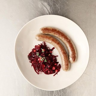 4В самом конце добавить несколько листиков тимьяна, нарезанное кубиком яблоко и нарезанный мелко лук сибулет. Подавать с жаренными колбасками.