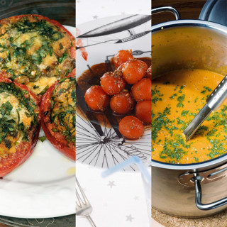 3Разогреть духовку до 100 градусов. Разложить дольки помидоров на противне внутренней частью вниз. Между дольками положить чуть раздавленные зубчики чеснока. Посыпать прованскими травами.