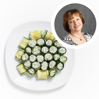 3Через пятнадцать минут, когда ленточки станут мягкими, с каждой поступить так: положить на конец (отступив примерно 1,5 см от края) по чайной ложке йогуртового сыра — и туго завернуть ролл.