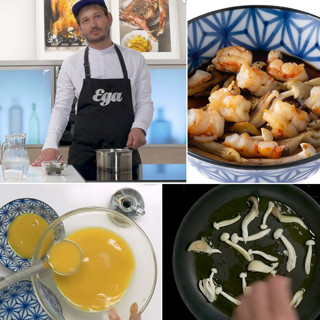 11В хаотичном порядке выложить грибы на готовый омлет, так же выложить креветки. Полить соевым соусом и подавать сразу же.